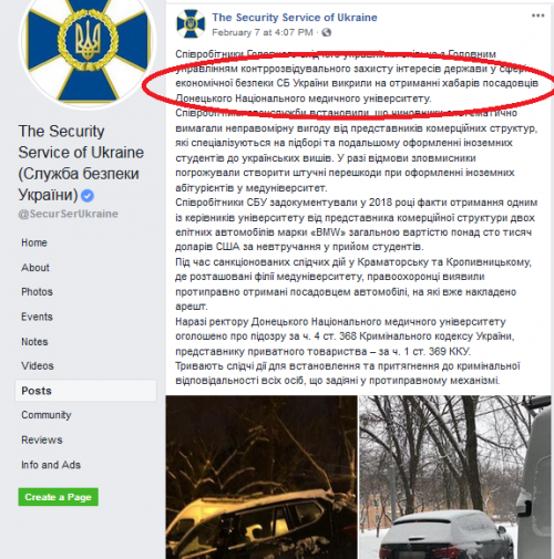 «СО Краматорского отдела полиции ГУНП в Донецкой области по признакам ч.1 ст.296 УК Украины внесена в ЕРДР № 120180503900003594 информация о событии от 20.10.2018 г. Расследованием установлено, что мотивом совершения правонарушенияя может быть экономиечская деятельность университета, связанная с обучением иностранных студентов и расчетов за их обучение по трехсторонним договорам с предприятием ООО «Украинские образовательные услуги» (ЕДРПОУ 37458011) та студентами. Допошенная в качестве свидетеля начальник юридического отдела ДНМУ пояснила, что контроль за своевременным поступлением средств за обучение возложен на соответствующи деканат и бухгалтерию .На совещаниях неоднократно лзвучивалась информация о том, что ООО «Украинские образовательные услуги» имеет дебиторскую задолженность. В мае 2018 г. потерпевший (ректор, которого избили неизвестные) поставил задачу подготовить письма с претензиями. Юротдел направил 43 претензии по юридическому адресу ООО «Украинские образовательные услуги» заказными письмами с уведомлениями. Через месяц письма вернулись, как не полученные адресатом. После этого указанные претензии отсканировали и отправили ректору на электронный адрес, а он, по его словам, отправил на эл. адрес контрактера. По ситуации на 20.11.2018 г. ответы на претензии не получены, задолженность не погашена».