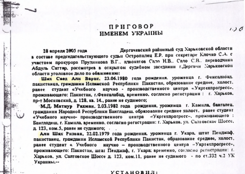 28.04.2005 он был осужден Дергачевским райсудом Харьковской области за то, что в течение 2004-2005 гг., еще будучи студентом, по сговору с 2мя другими иностранцами и неустановленными лицами, организовал канал незаконной переправки своих земляков из Пакистана через границу Украины в страны западной Европы и руководил этой переправкой много раз. При этом нелегальные мигранты использовали приглашения на учебу в украинские Вузы….