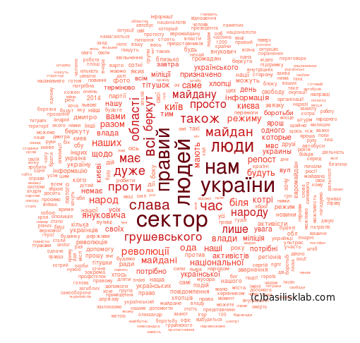 1. На первом этапе исследования мы собрали архив из 5115 информационных сообщений «Правого сектора» в наиболее многочисленной (400 тыс. участников) официальной группе «Правого сектора» в социальной сети Вконтакте (наиболее популярная социальная сеть среди сторонников этой организации) за период с 15 января по 1 апреля 2014 года. 2 апреля Роскомнадзор заблокировал доступ к страницам «Правого сектора» для пользователей из России, и мы завершили сбор данных и проанализировали данные, ограниченные периодом «до свержения Януковича» и «после свержения Януковича». Дальнейшая активность в группе, связанная уже с восстанием на Юго-Востоке и другими яркими событиями в исследование не попала.