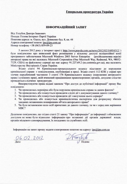 Глава Интернет партии Украины, Дмитрий Голубов обратился в ГПУ по поводу пользования пиратским программным обеспечением в МВД - об этом он сообщает в своем блоге. В информационном запросе, отправленном в Генпрокуратуру Украины, Голубов просит сообщить, ведутся ли следственные действия по факту использования нелицензионного ПО, проводится ли документирование этого правонарушения, планируется ли изъятие сервера с установленным на нем нелицензионном ПО и так далее. Напомним, на встрече с журналистами 1 февраля 2012 года руководитель пресс-службы МВД Виктор Полищук признался, что приблизительно 47% программ на компьютерах ведомства являются нелицензионными. "Но МВД проинформировало Microsoft. И теперь компания ведет переговоры с органами госвласти о легализации программного обеспечения", - сказал он. Это является нарушением авторского права и смежных прав, именно по этой причине были изъяты серверы популярного файлообменника EX.ua.
