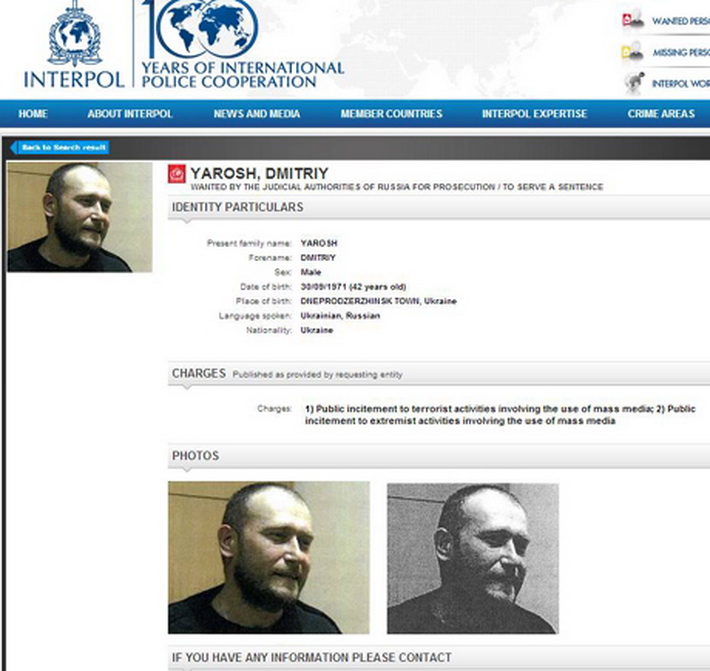 В базе Интерпола появилась фотография лидера Правого сектора Дмитрия Яроша. Его разыскивают судебные органы России.