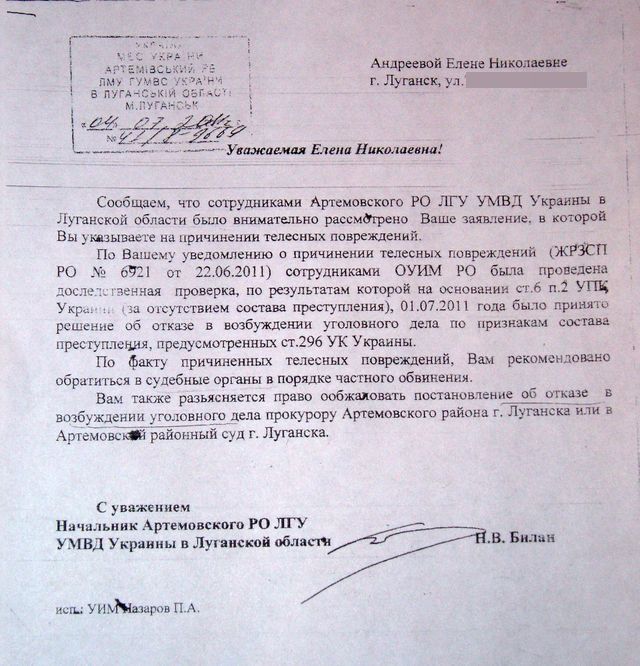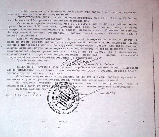 "Подобные события действительно имели место, но не два года назад, а 10.06.2011, когда мать Ирины Бережной - Бережная Елена Петровна, помощник народного депутата Ю. Кармазина, председатель Луганской областной организации Партии защитников Отечества - покусала меня в плечо при входе в Адвокатскую компанию «Андреева и Партнеры», где я работаю. Эти события происходили в присутствии свидетелей: адвоката, работников исполнительной службы, 3 человек опергруппы, участкового райотдела милиции. В своем рапорте участковый доложил руководству о хулиганских действиях Бережной Е.П., но уголовное дело так и не было возбуждено. Мной были обжалованы постановления об отказе в возбуждении уголовного дела, но далее дело пока не движется" - сообщила адвокат Андреева.