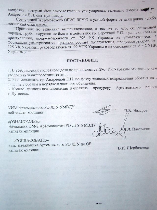 Елена Андреева опровергла информацию луганской милиции о том, что конфликт между ней и Бережной улажен:"Преследования продолжаются со стороны Бережной и Кармазина. Веры им нет! По «покусанию» конфликт со мной не улажен."
