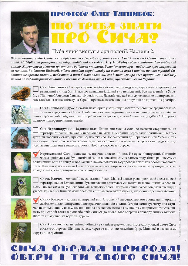 Новая провокация – это распространение листовок орнитологического содержания. В них якобы Олег Тягнибок призывает граждан выбрать Сыча, за которого хочет голосовать народ. Новые листовки вызывают как минимум улыбку, но все же против них кардинально настроены представители партии.