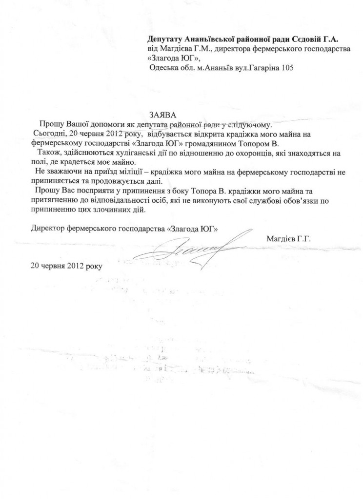 А вся выручка от продажи зерна, выращенного на нелегальных полях «чистоганом» идет в карман этом печально известному в Ананьевском районе судье. За это Топор имеет индульгенцию на пол- ную безнаказанность в своих действиях: не платит налоги (за 2011 года вместо 155 000 гривень он заплатил в бюджет налогов только 152 гривни), у пайщиков нету никаких документов (даже земельных актов…), договора с пайшиками были заключены полностью неправильно и незаконно и так далее..