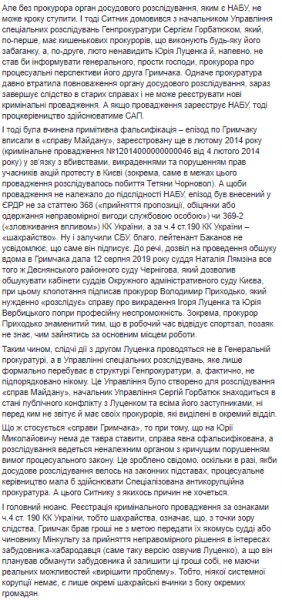 «Эпизод по Грымчаку вписали в «дело Майдана», зарегистрированное еще в феврале 2014 (уголовное производство №12014000000000046 от 4 февраля 2014) в связи с убийствами, похищениями и нарушением прав участников акций протеста в Киеве . Именно в нем фигурирует и нападение на Татьяну Черновол. А чтобы производство не принадлежало к подследственности НАБУ, эпизод был внесен в ЕРДР не по статье 368 («принятие предложения, обещания или получения неправомерной выгоды должностным лицом») или 369-2 («злоупотребление влиянием») УК Украины, а по ч.4 ст.190 УК Украины — «мошенничество»», — предполагает Бойко.