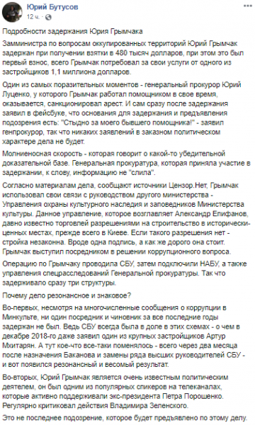 «Грымчак использовал свои связи с руководством другого министерства — Управления охраны культурного наследия и заповедников Министерства культуры. Данное управление, которое возглавляет Александр Епифанов, давно известно торговлей разрешениями на строительство в исторически-ценных местах, прежде всего в Киеве», — утверждает Бутусов.