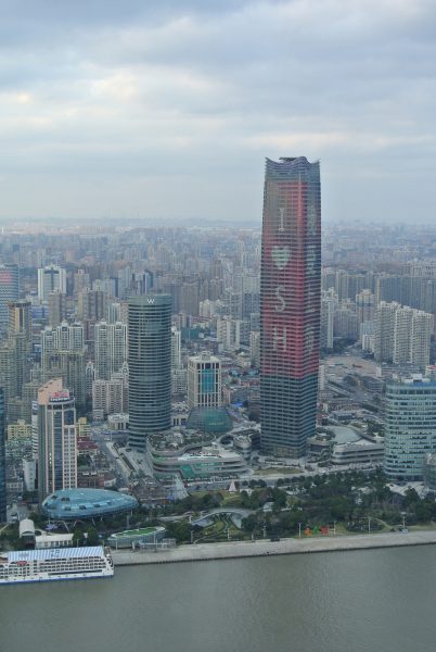 Есть только одно-единственное место в Шанхае, с которого в таком ракурсе видны главные достопримечательности Пудуна — района небоскребов на правом берегу реки Хуанпу: небоскребы (слева направо) Цзинь Мао, Шанхайский всемирный финансовый центр, Шанхайская башня и знаменитая телебашня. (Все эти шедевры архитектуры вы можете лицезресть слева от организма левитирующего генпрокурора).