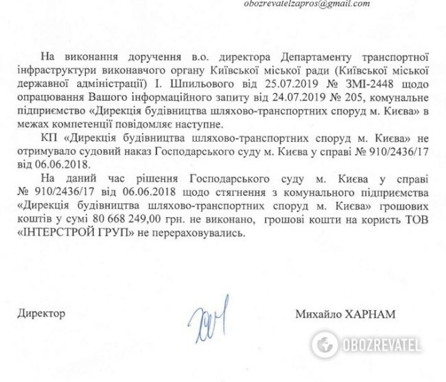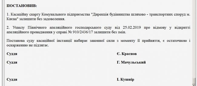 И Кассационный хозяйственный суд в составе Верховного суда 23.05.2019 вынес постановление об оставлении без удовлетворения жалобу коммунального предприятия «Дирекция строительства дорожно-транспортных сооружений г. Киева».