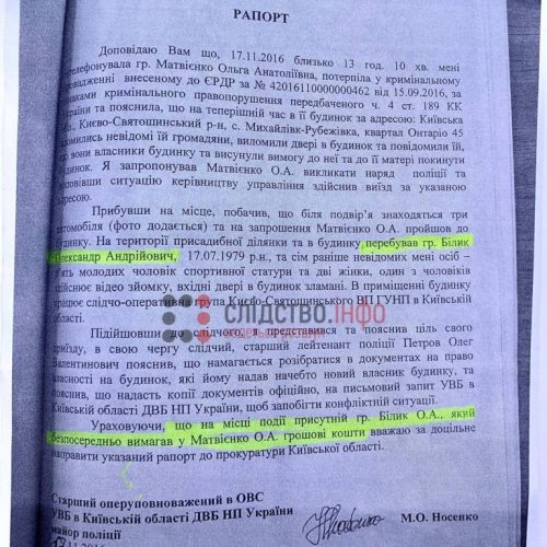 Они встретились в кафе в пригороде Киева. Ольга говорит, что этот человек якобы требовал у нее 70 000 долларов, или угрожал устроить проблемы с помощью «связей в правоохранительных органах». Позже она узнала, что мужа зовут Александр Билык и он работал в киевской полиции. Впоследствии Ольга увидит его и среди тех, кто пришел выселять ее из дома. То, что Александр Билык был в ее доме, официально зафиксировали правоохранители — соответствующий рапорт написал работник внутренней безопасности полиции.