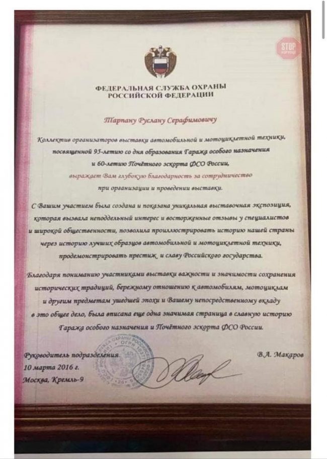 Еще в конце прошлого года издание «Стопкор» обнародовало сведения о вероятном сотрудничестве разыскиваемого Тарпана с федеральной службой охраны России. В 2016 году он, в частности, получил от ФСО России именную благодарность.