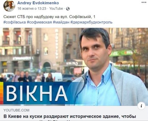 При этом горе-чиновник не брезгует пиаром на общественно важных темах. В частности, судя по FB-странице Евдокименко, он чуть ли не самый главный борец за справедливость в Киеве. Речь о нашумевшей пристройке на крыше одного из домов на Майдане Независимости. Количество эфиров, где Евдокименко пиарится на этой теме, сложно сосчитать. При этом он почему-то не рассказывает журналистам о том, что именно его структура выдала разрешение «на реконструкцию», вызвавшую такой общественный резонанс.