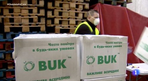 А вот второе фото от 19 марта — испанские рабочие разгружают машину с респираторами киевской компании ”Бук”.