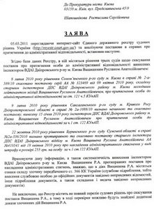 С нарушением пятидневного срока, Днепровская прокуратура прислала нам копию постановления от 16 августа 2011 года касательно возбуждения в отношении Ващишена Р.А. дисциплинарного производства по факту отмены судами его штрафов.