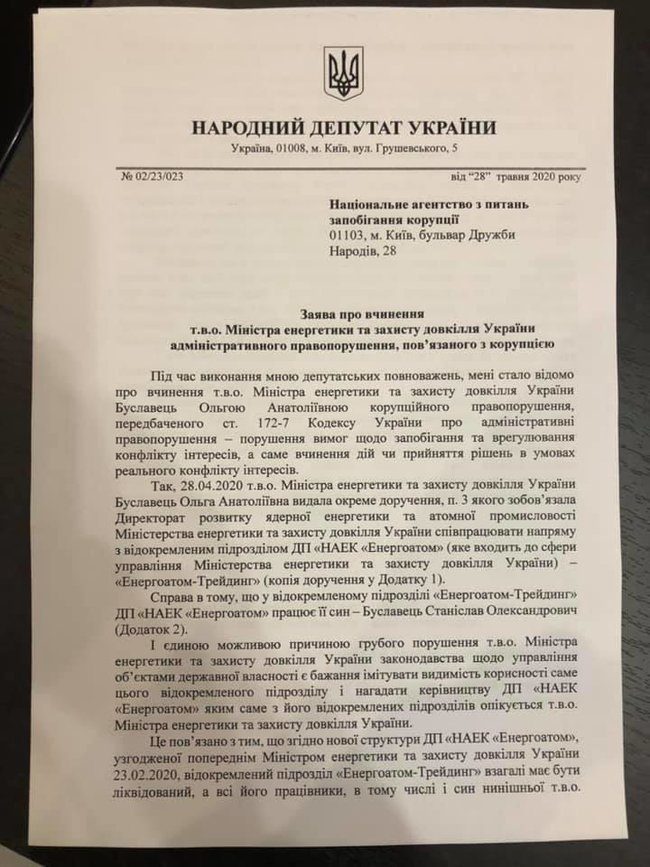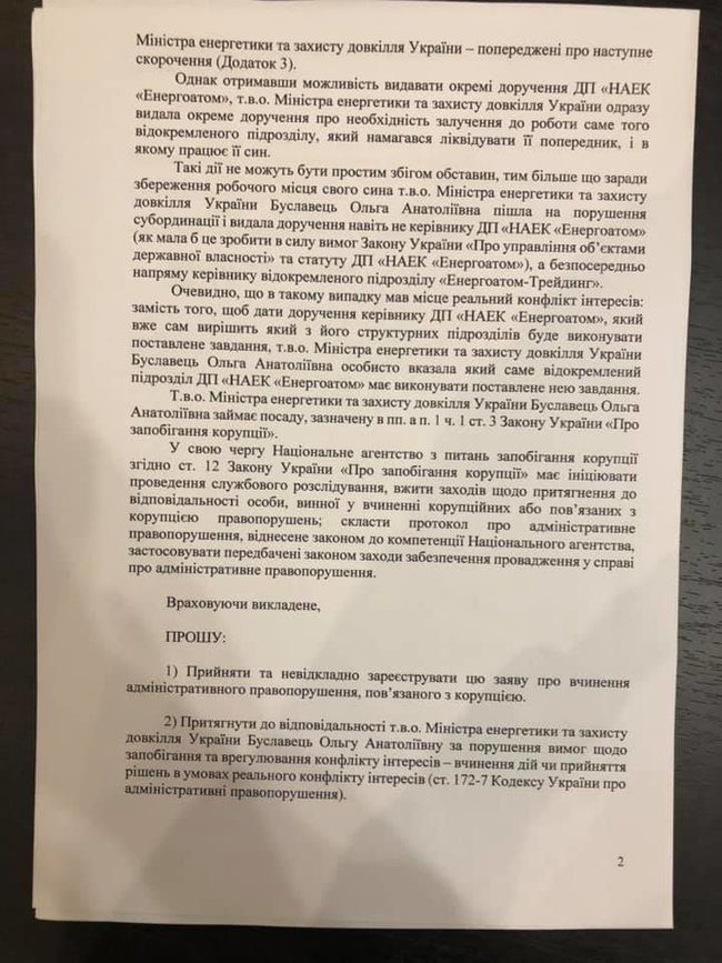 «Министр энергетики Ольга Буславец должна быть внесена в реестр коррупционеров за нарушение антикоррупционного законодательства. Министр действовала в состоянии реального конфликта интересов, когда 8 мая напрямую дала «окреме доручення» подразделению Энергоатома, для того, чтоб сохранить выведенное ранее подразделение, в котором работает её сын», — заявил нардеп.