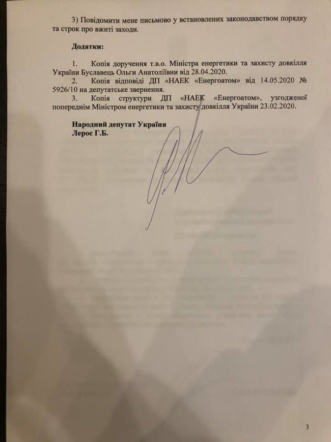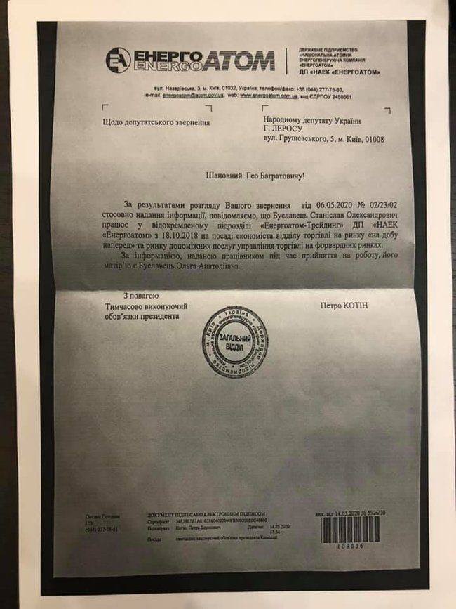 По словам нардепа СН Гео Лероса, врио главы Минэнерго Ольга Буславец действовала в состоянии конфликта интересов, когда 8 мая напрямую дала «окреме доручення» Энергоатому, чтобы сохранить от ликвидации подразделение, в котором работает ее сын.