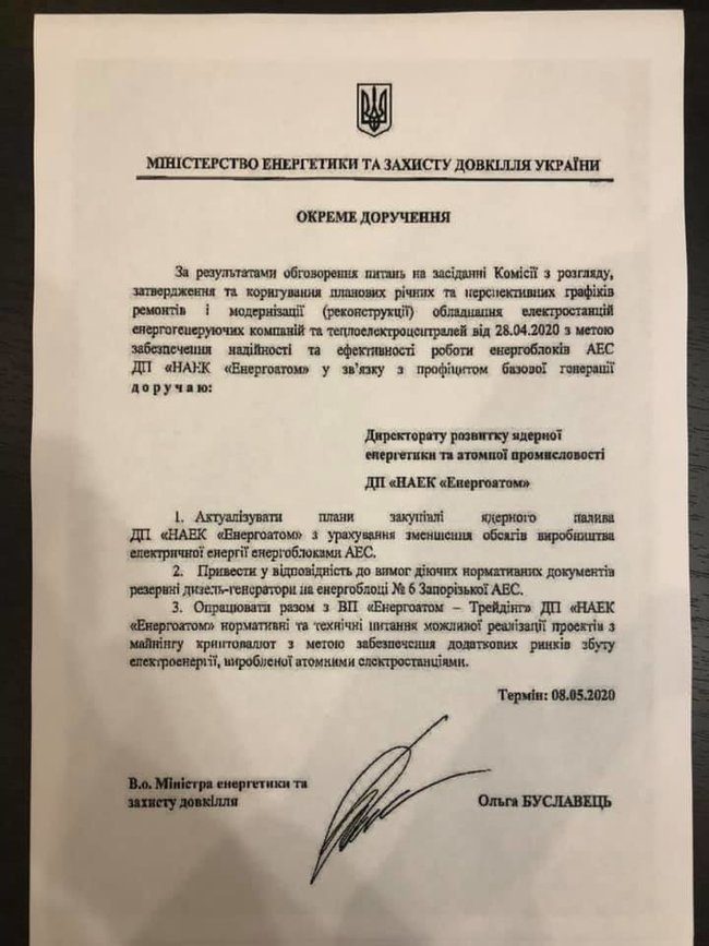 «Энергоатом — оператор ядерных установок, имеет в своей структуре обособленные подразделениия. Все эти подразделения являются неотъемлемой частью всей Компании, а их руководители подчиняются исключительно руководителю Энергоатома. Самое новое из созданных обособленных подразделений ВП Енергоатом-Трейдинг. Это подразделение создано специально под новый рынок для торговли электрической энергией на всех сегментах рынка вырабатываемой на атомных станциях. То есть, на атомных станциях электроэнергию вырабатывают, а Енергоатом-Трейдинг ее продаёт. И вот в этом подразделении в отделе «торговли на рынке на сутки вперёд» работает Буславец Станислав Олександрович, сын нынешней врио министера энергетики и защиты окружающей среды. Министр имеет полную власть над руководителем Энергоатома, именно министр вносит на Кабинет Министров Украины представление на увольнение или назначение президента компании и его заместителей — вице-президентов. И вот 28 апреля врио министра Ольга Буславец, выдаёт «окреме доручення», в п.3 которого поручает директорату Развития ядерной энергии и атомной промышленности и ГП НАЭК Энергоатом совместно с обособленным подразделением Енергоатом-Трейдинг ДП НАЕК Енергоатом «опрацювати питання можливого майнингу криптовалюти атомними станціями». То есть, врио министра дает «окреме доручення» врио президента Энергоатома П.Котину работать со своими подчиненными, которые работают в Энергоатом-Трейдинг. Поручение абсурдное, но напоминаю именно в этом подразделении работает сын Ольги Буславец, который занимается продажей э/э», — пояснил Лерос.
