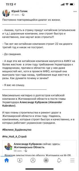 Юрий Голик после лишения должности советника премьер-министра Гончарука и председателя Укравтодора сейчас не занимает никакой должности, но он более чем «активный» в теме дорожного строительства, и не только в Фейсбуке. Кто платит Юрию Голику заработную плату, чем на самом деле и на каких принципах он занимается проектом «Большая стройка» — официальные данные отсутствуют.