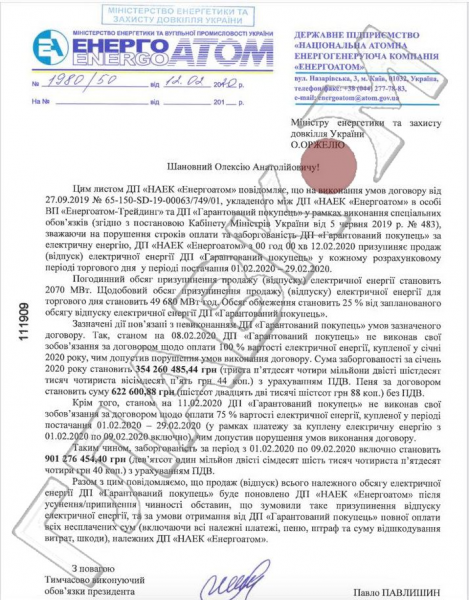 В качестве доказательства народный депутат Алексей Кучеренко разместил в Фейсбуке письма-предупреждения от временно исполняющего обязанности президента «Энергоатома» Павла Павлышина к министру экологии и энергетики Оржель и главы НКРЭКП Тарасюку о приостановлении продажи дешевой электроэнергии по специальным обязанностями государственному предприятию «Гарантированный покупатель» из-за нарушения платежной дисциплины. Возобновить продажу электроэнергии компания обещает только после полного расчета и устранения причин, которые привели к срыву платежей.