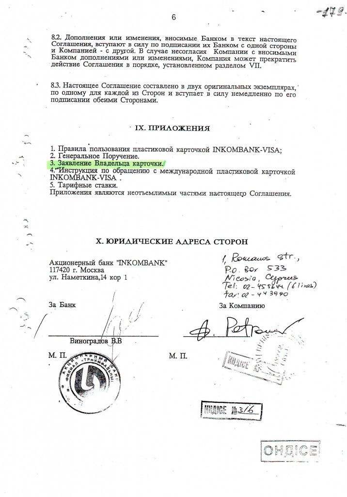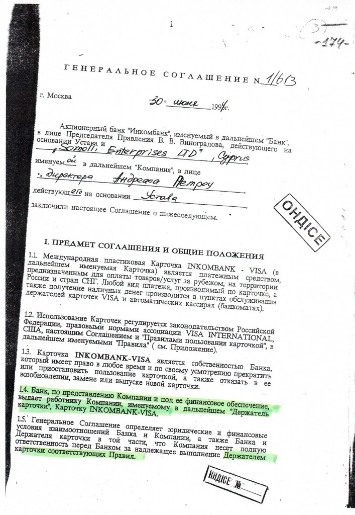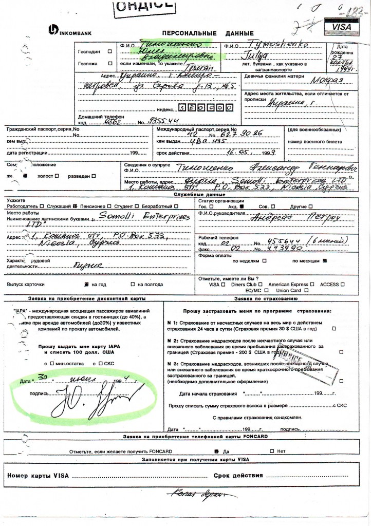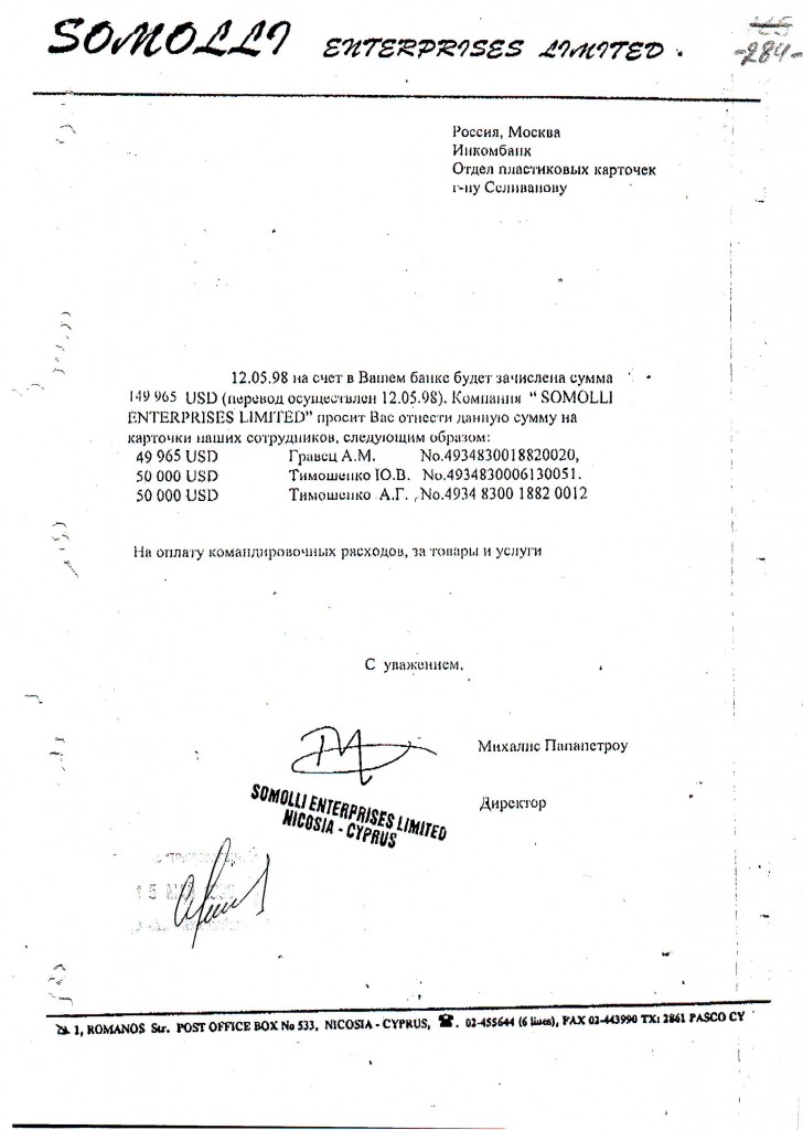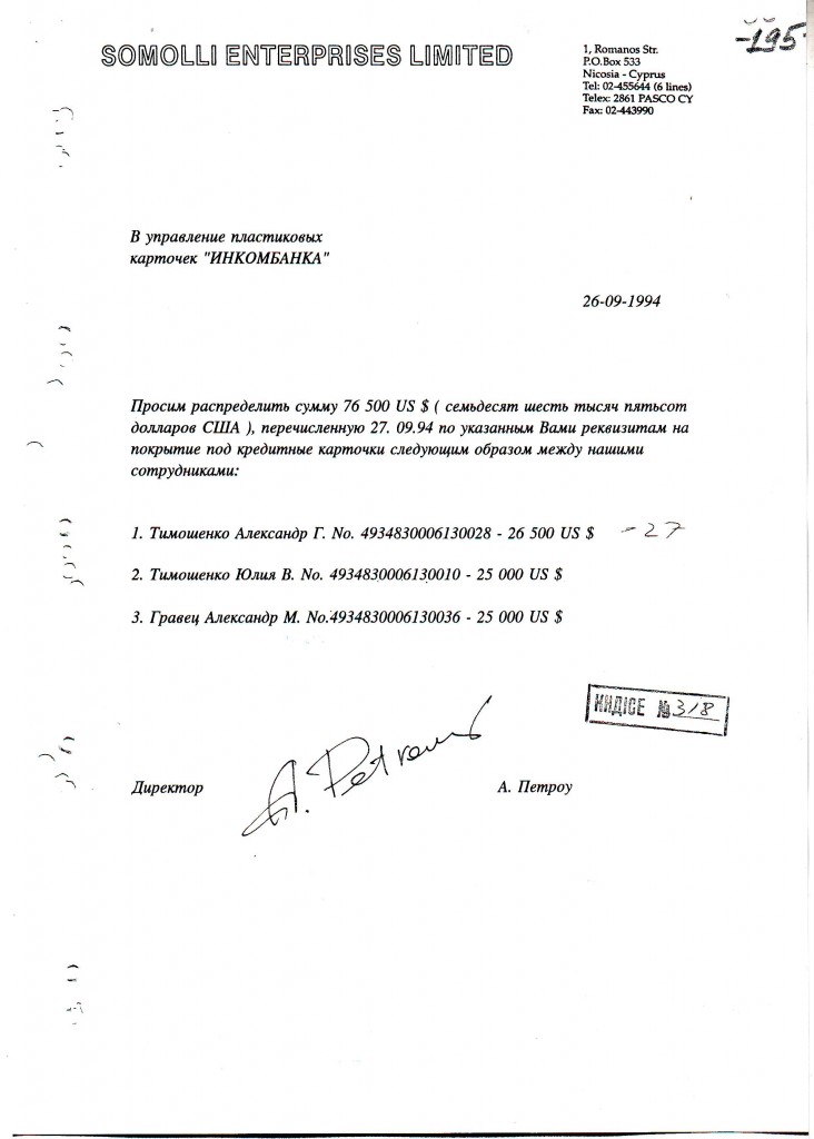 «Довідка. 30 червня 1994 року Акціонерний банк «Інкомбанк» м. Москва і компанія «Somolli Enterprises LTD» Кіпр в особі директора Андреаса Петроу, уклали генеральну угоду №1/613 про те, що банк, по заявці Компанії і під її фінансове забезпечення, видає співробітнику компанії, який іменується «Держатель картки» картку «Інкомбанк-Віза»… У відповідності з додатком до даного договору – заявою Тимошенко Ю.В. від 30.061994, написано нею особисто, вона стала держателем картки Інкомбанк-Віза».