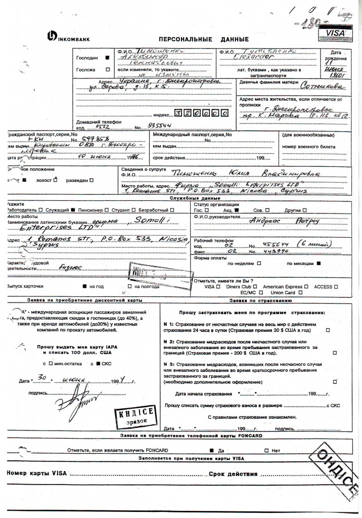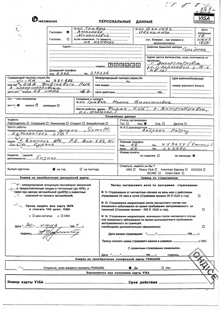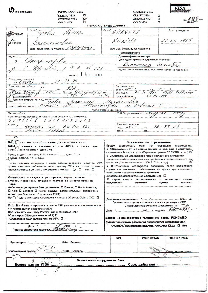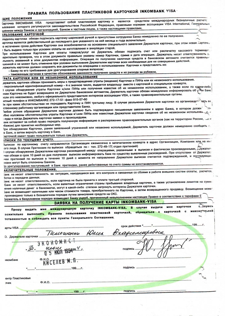 «Довідка. 30 червня 1994 року Акціонерний банк «Інкомбанк» м. Москва і компанія «Somolli Enterprises LTD» Кіпр в особі директора Андреаса Петроу, уклали генеральну угоду №1/613 про те, що банк, по заявці Компанії і під її фінансове забезпечення, видає співробітнику компанії, який іменується «Держатель картки» картку «Інкомбанк-Віза»… У відповідності з додатком до даного договору – заявою Тимошенко Ю.В. від 30.061994, написано нею особисто, вона стала держателем картки Інкомбанк-Віза».