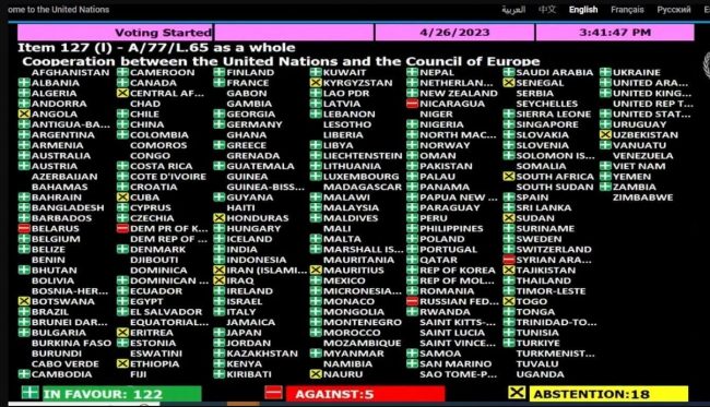 Отметим, что резолюцию, посвященную сотрудничеству ООН с Советом Европы, всего поддержали 122 страны. Кроме КНР, документ одобрили и несколько других стран, которые считаются дружественными к России, в частности Казахстан и Армения, а также Индия и Бразилия.