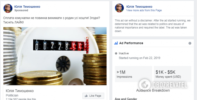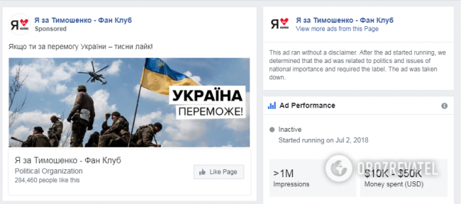 Юлия Владимировна начала активно размещать политическую рекламу в Facebook еще 27 июня 2018-го. Дороже всего обошлись бюджету кандидата рекламные посты группы "Я за Тимошенко - Фан Клуб". Сейчас в этом сообществе более 280 тыс. участников.