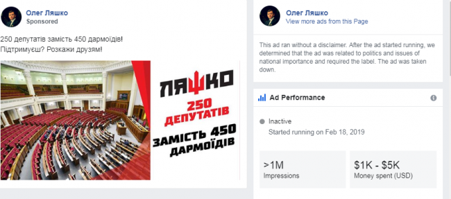 Лидер Радикальной партии Олег Ляшко активно занимается своей личной страницей в Facebook, ее и поддерживает рекламными постами.