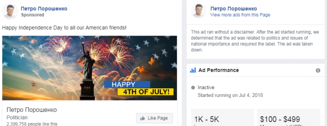 Менее активен в социальных сетях действующий президент Петр Порошенко. Во всяком случае, всего около 20 постов с его фамилией Facebook посчитал политической рекламой. Стоимость публикаций варьируется от $100 до $4000. Правда, еще не все публикации прошли проверку.