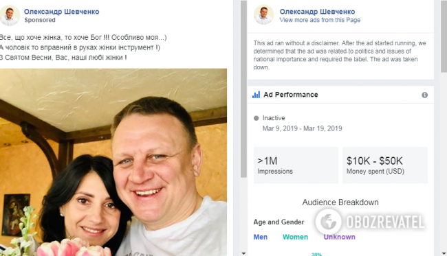 К примеру, пост с поздравлением с 8 марта обошелся кандидату в $10-50 тыс. Всего в Facebook размещено около 30 рекламных постов кандидата на общую сумму до $100 тыс.