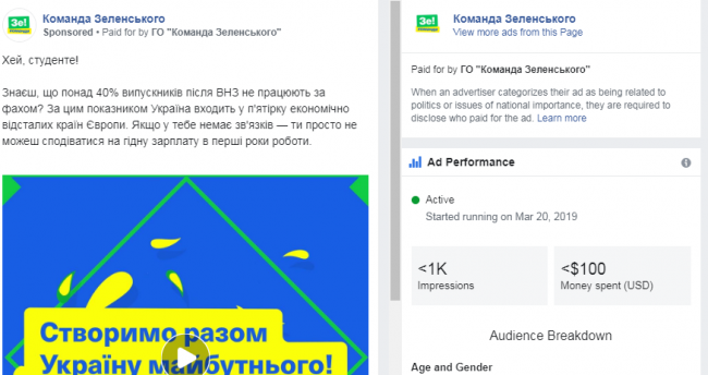 Из пятерки лидеров единственный кандидат, которые опередил Тимошенко по количеству рекламы в соцсети – Владимир Зеленский.Большинство публикаций оплатила общественная организация "Команда Зеленского". Активно размещают рекламные посты не только администраторы основной группы, но и региональные сторонники Зеленского. Одна из наиболее активных – "Команда ЗЕ" в Донецкой области.