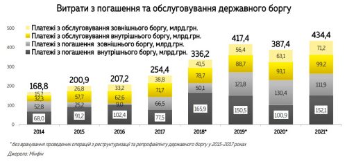 Облигации – еще одна головная боль украинской экономики. Они составляют львиную долю внешнего и внутреннего долга и, соответственно, выплат по ним (см. диаграмму). Большую часть внешних «кредитов» Украина берет через механизм облигаций. Именно облигации чуть не стали причиной дефолта в 2015 году, и это долг по ним пришлось реструктуризировать на грабительских условиях.