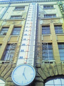 «На улице Горького я увидел шестиметровый градусник, - рассказал Андреевич. - Когда приехал в Харьков, встретился с директором Института метрологии, совместно с которым мы приняли решение установить градусник на здании по улице Сумской, 11. Конечно, место выбрано не очень удачно, потому что из-за прямых солнечных лучей показания становится видно только после обеда. Однако этот градусник обладает высшей степенью точности, за все эти годы он ни разу нас не подвел». Харьковский градусник значительно превзошел московский: высота символа первой столицы составила 16 метров - с тех пор встречи «под градусником» стали частью жизни города.
