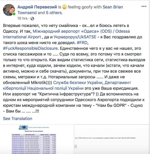 Перевезий Я осознаю. Но за безопасность Одесского аэропорта несет ответственность Одесский аэропорт, не я. Хотя мы все передали. Один из наших товарищей, Владимир Попов, лично ездил к директору Одесского аэропорта и показывал уязвимости. Я лично встречался с помощником Криклия (министр инфраструктуры) и показывал уязвимости. Мне сказали: «Одесский аэропорт является частной собственностью». Тогда почему я должен нести за это ответственность?
