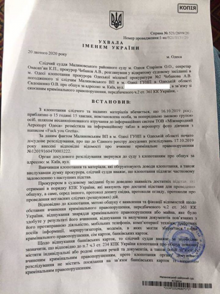 15 октября 2019, то есть за неделю, кто-то взламывает сети Одесского аэропорта и «размещает на информационном табло в аэропорту фото девушки с надписью» Fuck you Gretta «.