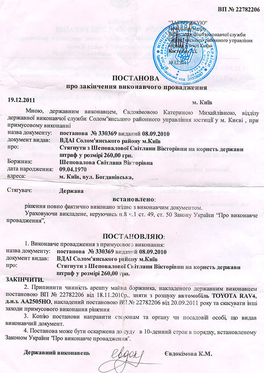 В декабре 2011 года в редакцию "Дорожного контроля" обратилась Светлана Шеповалова с жалобой на то, что ей не отдают ее автомобиль TOYOTA RAV-4. Изначально, ГАИшники забрали машину на основании постановления Государственной исполнительной службы ВП №22782206 от 18.11.2010 года, которым был арестован вышеуказанный автомобиль на основании неуплаты штрафа в размере 260 грн (!), хотя сама Светлана о существовании такого постановления ГИСа не знала.