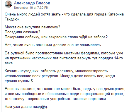 Можно было бы сказать, что выяснение отношений завершилось ничем, но именно с этого дня гнойная шишка лопнула, проблема вышла за пределы региона. Разбив в пух и прах обе стороны, в одном из комментариев Гандзюк написала: «Мне было пох – кто там и как будет пилить лес: Цегельник по чуть-чуть, или Мангер с Гордеевым оптом. Теперь не пох. Будет вам скандал, если так просите». Возможно, именно эти слова запустили обратный отсчет (ведь слов она обычно на ветер не бросала)?