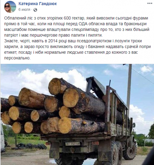 6 июля Катерина опубликовала фото подгоревшего леса, который вывозили фурами прямо во время митинга у облгосадминистрации. Назвала браконьерами обе стороны.