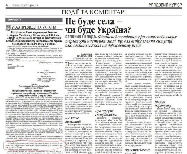 В правительственной газете «Урядовий кур’єр» опубликовали текст указа, который предусматривает введение военного положения в Украине сроком не на 30 дней, за что проголосовала Рада 26 ноября, а на 60, как ранее предлагал СНБО, передает Обозреватель.