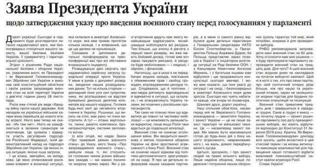 В то же время в электронной версии правительственной газеты говорится: «9 часов утра 28 ноября навсегда войдет в историю Украины. Именно с этого момента на территории, прилегающей к РФ, Приднестровье, и в Азовочорноморський акватории вводится военное положение. В случае военной агрессии РФ».