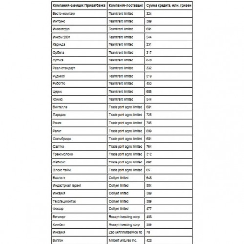 Многие "горе-заемщики" "ПриватБанка" имеют много общего с группой "Приват" днепропетровского бизнесмена. К примеру, фирма "Реал-стандарт" пять лет назад продала долю акций в подконтрольной Игорю Коломойскому "Укрнафте" фирме "Мериста" (это предприятие числится среди инвесторов "Приватбанка"). Фирмы "Виглон", "Инвестгруп", "Веста-компани" и "Инкерия" участвовали в борьбе за киевскую гостиницу "Мир", которую вели приватовские структуры. Компании "Трансмолоко" и "Техспецмонтаж" год назад вместе с "Приват Интертрейдинг" проходили по уголовному делу против одной из частных фирм, подозреваемой в уклонении от уплаты налогов.