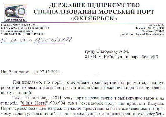 В Міністерстві підтвердили, що в 2011 році відходи ГХБ утилізувалися в Польщі. Але на пряме запитання, куди вирушило судно з гексахлорбензолом, яке вийшло з миколаївського порту "Октябрськ" 10 листопада минулого року, в міністерстві відповіли, що весь 2010 відходи ГКХ відправлялися з Миколаєва на спалення у Великобританію.