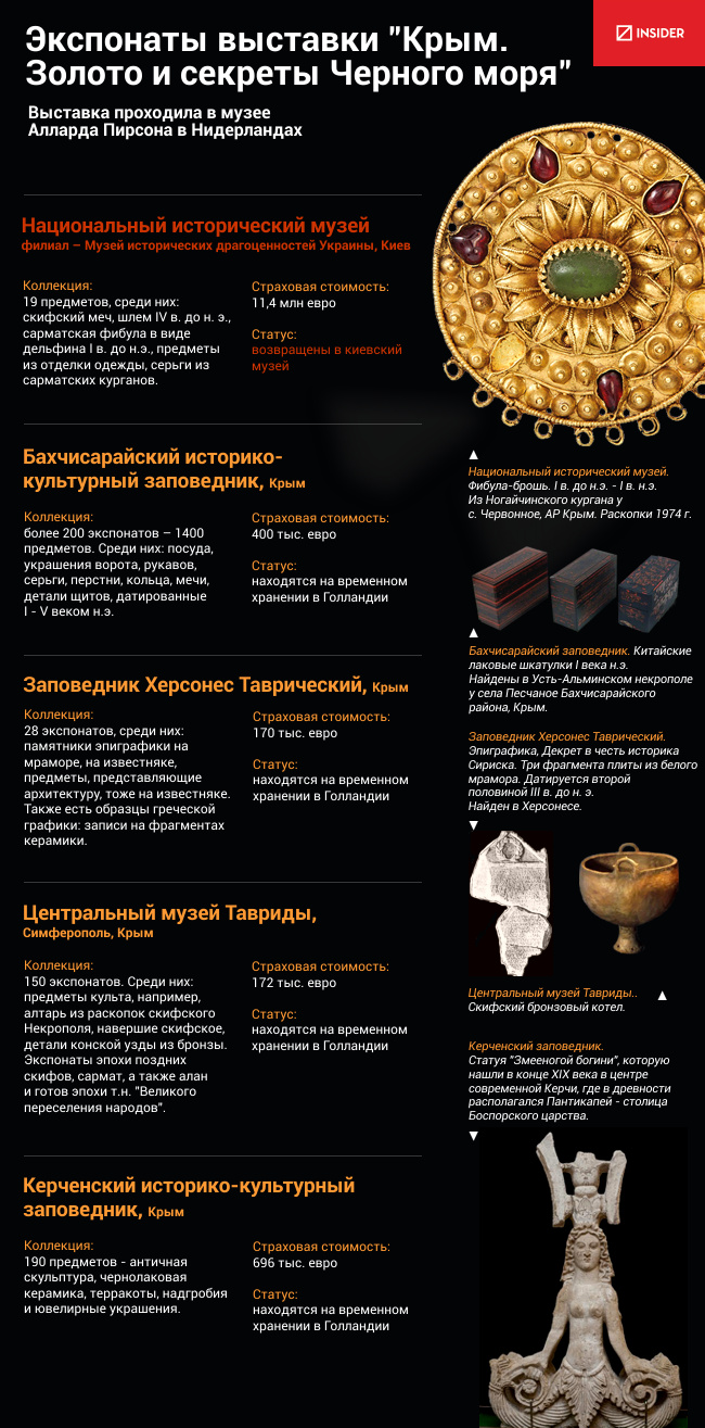 - Согласно договору, предметы для выставки "Крым: золото и тайны Черного моря" были предоставлены музеями, которые были на тот момент хранителями соответствующих музейных предметов. Как отмечалось, владельцем всех музейных предметов государственной части музейного фонда Украины является украинское государство и его граждане, - говорится в официальном ответе ведомства культуры на запрос INSIDER.