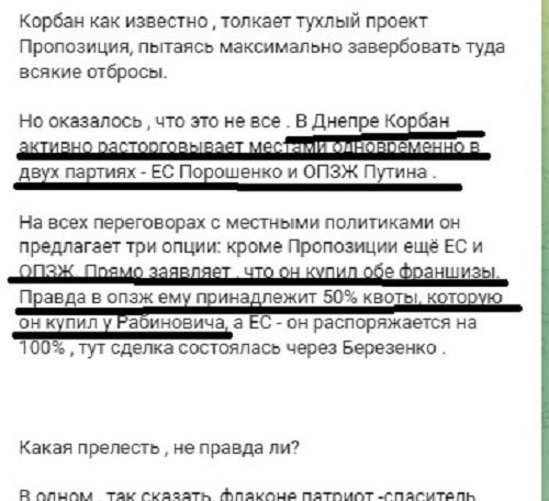 Суть этой информации сводилась к тому, что Корбан перекупил 50% избирательной квоты у ОПЗЖ и 100% у ЕС. Относительно ЕС подтверждений так никто и не опубликовал – скорее всего не потому, что это было непрвдой, а потому что там были более умные люди, чем в ОПЗЖ. Или не столь жадные – внутреннюю документацию Депропетровского областного штаба ОПЗЖ через несколько месяцев, в самый разгар избирательной кампании, кто-то продал конкурентам.