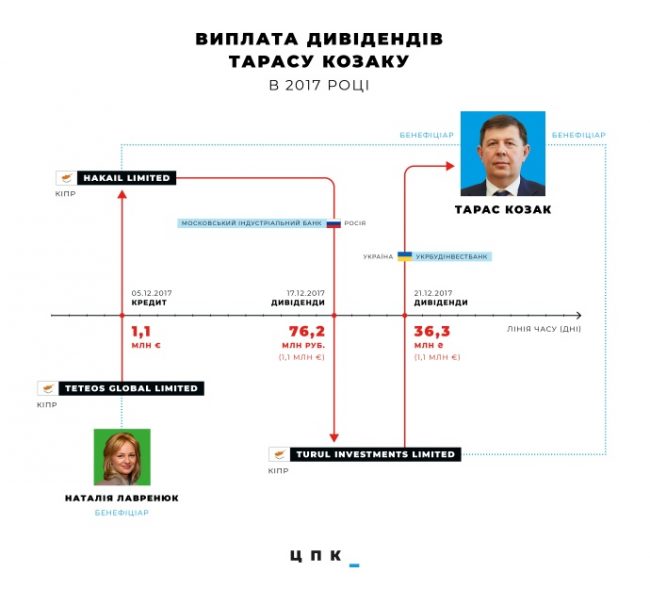 Свои первые большие дивиденды – 1,1 млн евро – от Turul Investments Limited Козак получил в 2017 году со счетов в российском банке.