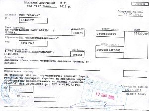 В платежном поручении № 43 от 6 августа 2012 года в назначении платежа указано: “Судебные расходы за предвыборную кампанию Партии регионов и Компартии согласно приказу от 16.09.2012 года, дело № 5005/2590/2011”.