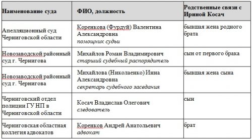 Но если проанализировать специализированные ресурсы о судьях Украины, то оказывается, что у Ирины Косач в Черниговской области родней «схвачена» вся основная судебная цепь – следствие, адвокация, суд, апелляция: