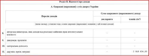 А теперь смотрим в декларации доход Вадима Нечая за 2014 год – 101 204 гривен (т.е. в среднем 8 434 гривен в месяц). Откуда же деньги на хоромы? Все просто – в графе «Подарки, призы, выигрыши» членов семьи значатся 2 млн 918 тыс. 634 грн. Смотрим выше по тексту: цена квартир в центре Киева – 2 млн. 918 тыс. 634 грн. Бинго! Ага, в лунопарке в тир выиграли.