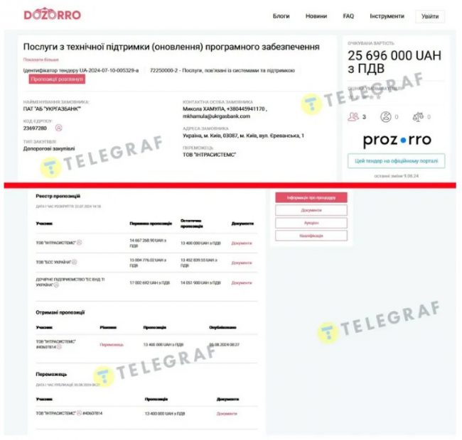 «У «Укргазбанка» с ней также тесные отношения. Судя по данным Prozorro – банк не раз закупал у этой фирмы оборудование, программное обеспечение и услуги по его обновлению. В 2023 году «Укргазбанк» приобрел у «Интрасистемс» абсолютно идентичны услуги по технической поддержке (обновлению) того же программного обеспечения Oracle, что и во время упомянутого тендера в июле 2024 года (разве что в 2023-м закупалось не 42, а 33 комплекта)», – рассказывают аналитики.