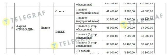 Более того, подчеркивается, об одном из заявленных журналов – «Громады» – никто не знает. А ему «Укргазбанк» согласился платить почти 100 тыс. грн за публикацию на последней странице обложки и вдвое дешевле за «внутренние» публикации.